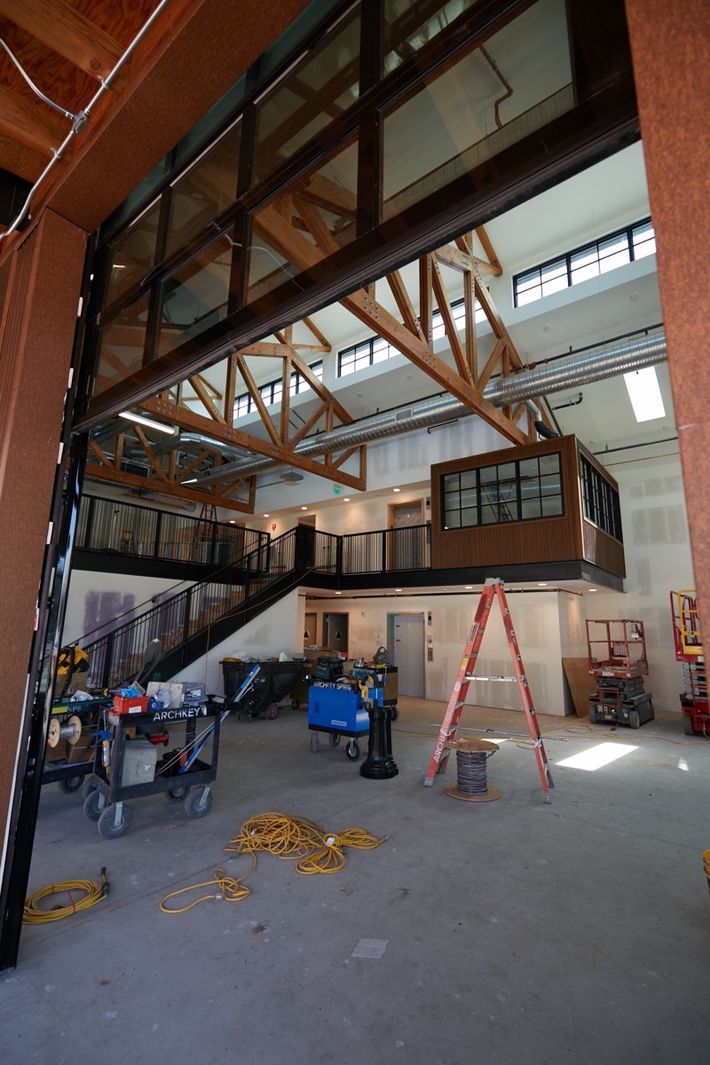 Nearby, over at the corner of Main and Chestnut streets, the construction fencing around the stand-alone restaurant building that is part of the ELCO Yards project has come down — another checkpoint crossed! — allowing me to walk right up to the building and get some interior photos, like this one: