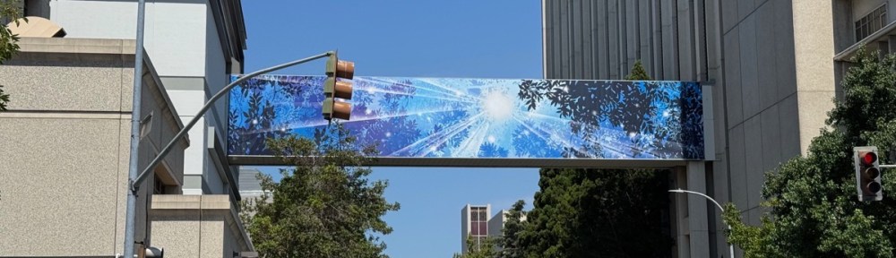 That bridge — which connects the Correctional Facility (on the left) with the County Hall of Justice (on the right) — has of course been there for many years, but it finally seems to have occurred to someone that the bridge represented a great place for a bit of public art. And this cosmic scene is the result (the same image has been applied to the backside). What a great idea! It never crossed my mind to suggest it as a location for a new mural, so I’m really glad someone else thought of it.
