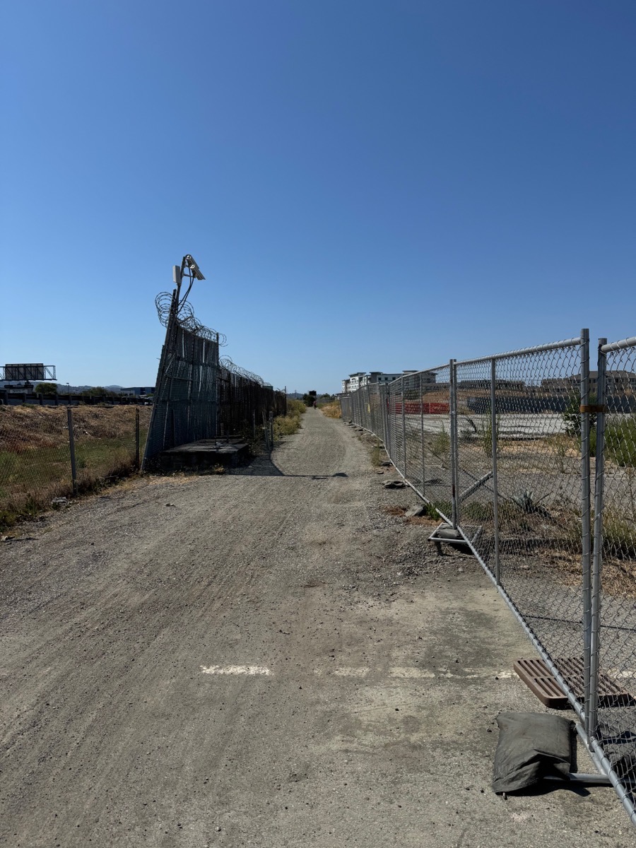 Along with the closure of Docktown, the walking/cycling path that used to lead through the middle of the parcel has once again been re-routed to the perimeter: the path now runs right alongside Highway 101 from the “bridge to nowhere” (which crosses Redwood Creek just east of the freeway) to where Maple Street terminates pretty much up against the freeway. Here is what it looks like from the Maple Street end: