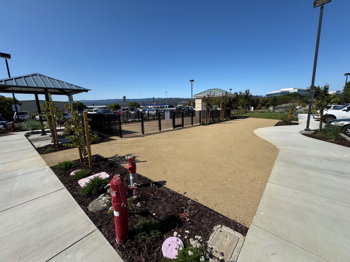 The checkpoint that all projects want to reach, of course, is the final one, and the somewhat mysterious project that was going on in the parking lot of MidPen Housing’s 95-unit Shores Landing senior supportive housing community at the southern end of Twin Dolphin Drive has finally reached theirs: the construction fences are down, and today I was able to wander through the lovely outdoor space that has been created for the building’s many residents: