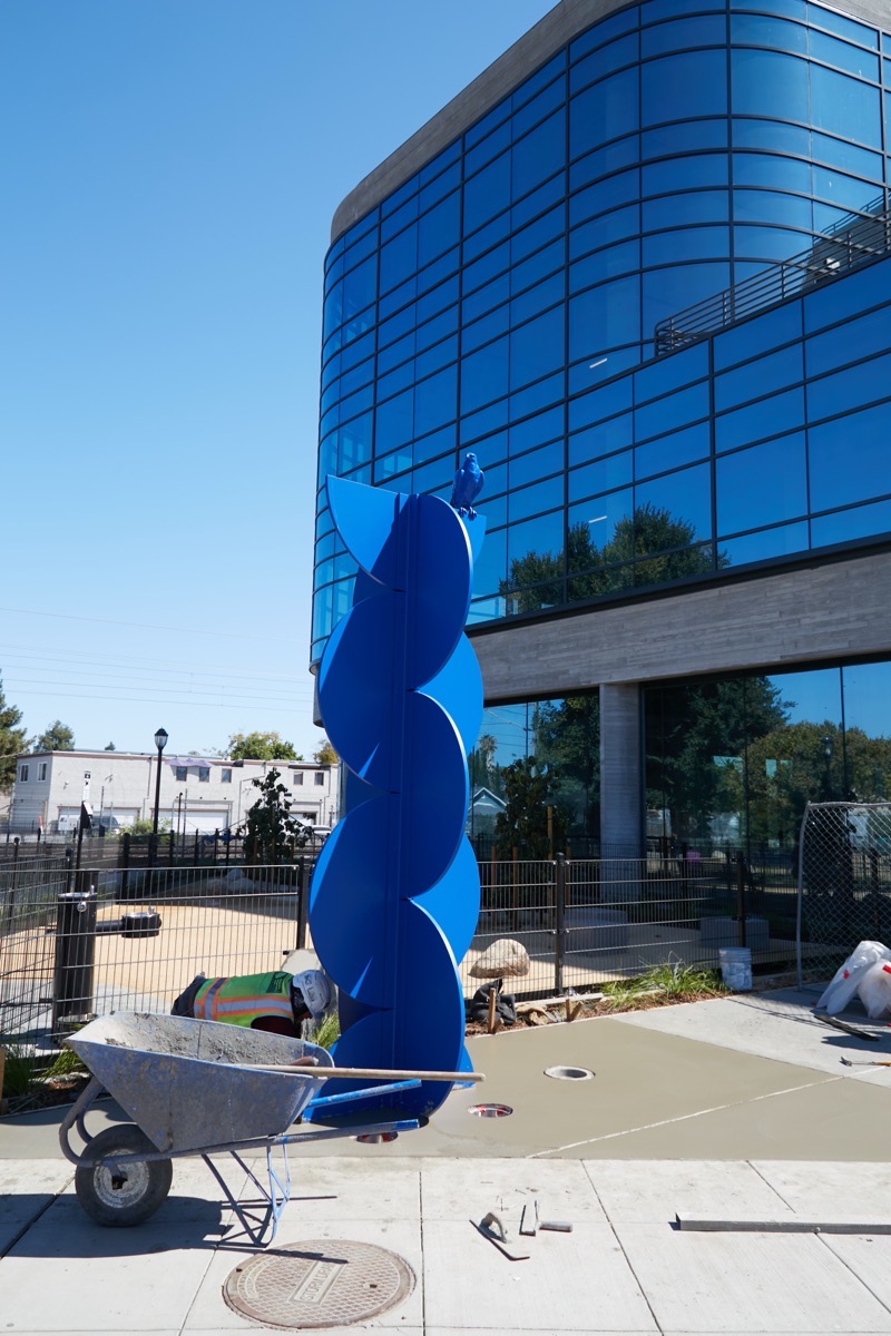 I need to go back and see if there is a plaque giving some background on this blue metal sculpture. When I was there, as you can probably see, work was still underway on the concrete slab beneath the sculpture, so I couldn’t get too close. But it looks to be made up of a set of large, interlocking steel discs, atop which a metal bird is perched. While this almost looks as if it could be used as a sign listing the tenants that will soon occupy the adjacent building, I doubt that is its purpose: most likely this really is just an interesting piece of public art.