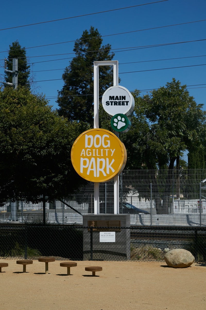 As you can see from the above picture I captured back in 2018, over the years the sign — whose principal elements were three circles of varying sizes and colors, one emblazoned with the words “Main Street,” one proclaiming “Coin Op,” and the final one stating “Car Wash” — was eventually almost entirely blocked by a large palm tree. In any case, to honor that long-time Redwood City business (it opened in 1965, and operated until 2021), the car wash sign, too, was refurbished (with the words changed somewhat) and installed in the Main Street Dog Agility Park, which is located along Main Street about a block from where the car wash once stood: