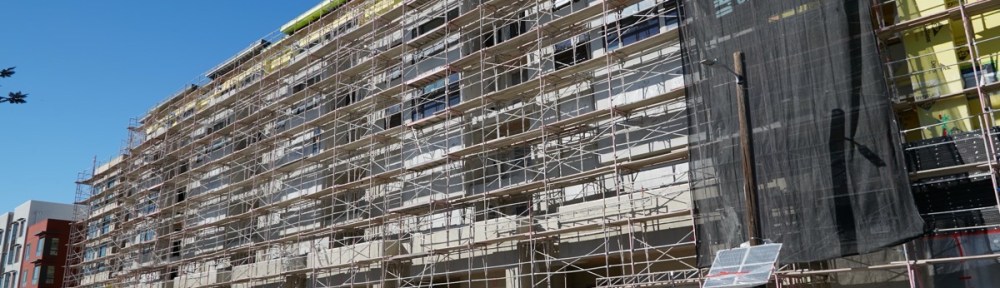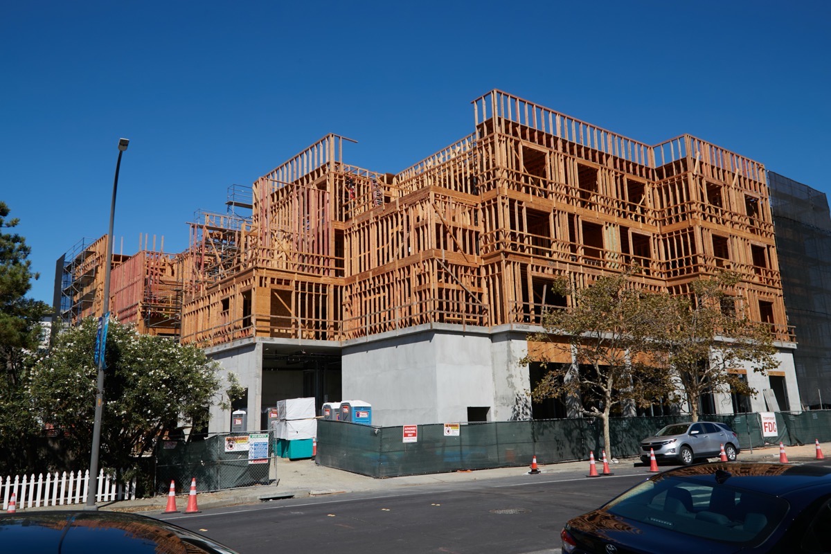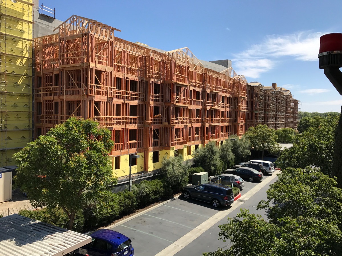 This is the same technique that was used to construct the six-story apartment building out at Blu Harbor (the large apartment complex at the end of Bair Island Road). Back in late 2016 I took the following picture of that development, showing some of the building’s many apartments starting to be framed up around that project’s giant by-then-completed concrete parking garage:
