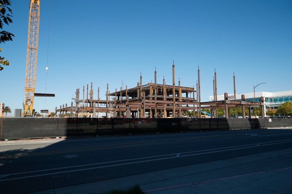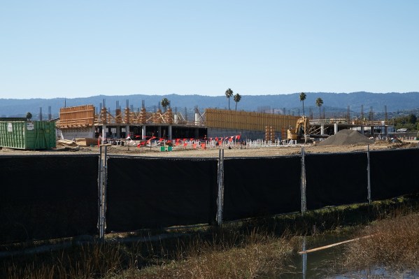 Across the freeway, on East Bayshore Road, the first of the two apartment buildings that will eventually stand where the Century Park 12 Theatres used to be located is making fine progress. Both of the five-story apartment buildings (only one of which is currently underway) are designed such that the apartments wrap almost entirely around full-height central parking garages. Accordingly, having prepped the site for the entire first building — in the following picture you can see that the prep work involved a lot of the plumbing and other utilities needed for the apartments themselves (note the field of white pipes sticking up from the ground) — the contractors are focused for now on building the northern building’s central garage: