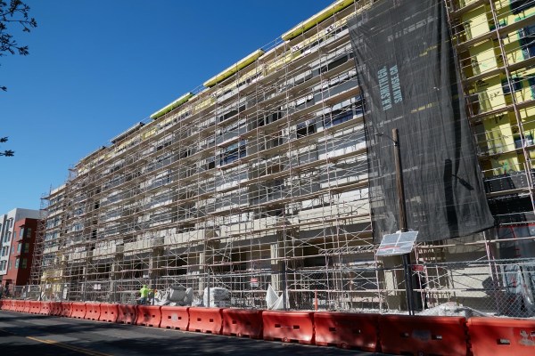 On Bay Road just north of Woodside Road, the third and final apartment building making up the residential portion of the Broadway Plaza project is now getting its exterior finishes:
