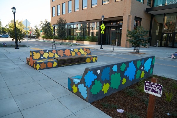 No round-up of Redwood City projects would be complete without mention of the ELCO Yards project, and this week’s mention is a big one: the project’s first phase, consisting of the four office buildings, now seems to be complete! Although no tenants have moved in as yet, essentially all of the construction fencing is down, and the streets and sidewalks are wide open. Pretty much all of the construction vehicles have left the area, and everything is clean and bright (well, some of the windows could use a good wiping…). I was down there twice this week, and was able to walk completely around all of the buildings, including the stand-alone restaurant building at Main and Chestnut Streets. So, for example, I was able to sit on some more of those crazy benches that are located along Lathrop Street between two of the offices: