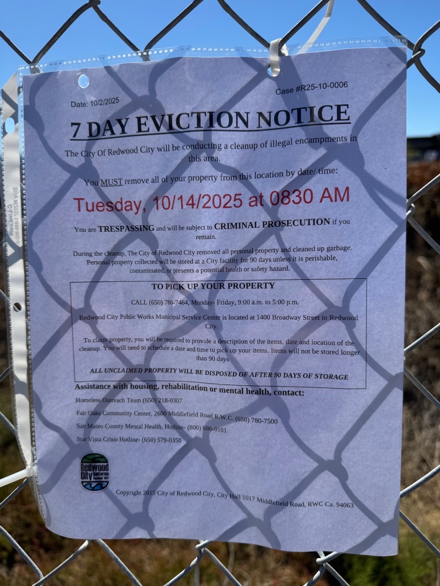 (Just behind these makeshift homes, on the left, is Highway 101.) As I walked by, I observed that the city has posted 7-day eviction notices on the fence beside each individual structure: