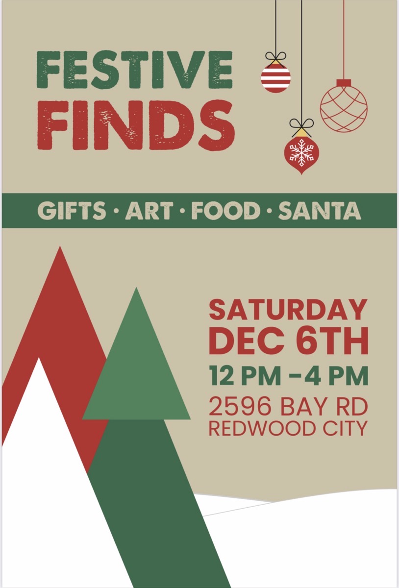 You’ve probably seen the signs around town, but in case you haven’t looked closely, the 3rd annual “Festive  Finds” crafts fair is taking place on Saturday, December 6th from noon to 4 p.m. It will feature art and gifts appropriate for the season, plus there will be food, and a visit from Santa Claus! So mark your calendars, tell your friends, and bring your family. This year Festive Finds will be located at 2596 Bay Road, in Redwood City: at the corner of Bay Road and Douglas Avenue.