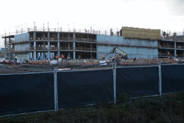 Look closely [click the image to get one you can zoom in on] and you can see that surrounding the forest of utility pipes and conduits sticking up from the ground in front of the garage are forms for the concrete foundation that will underpin the apartments. This one building will contain 222 apartments (studios, 1-bedroom, and 2-bedroom units), many of which will face out over Bair Island.