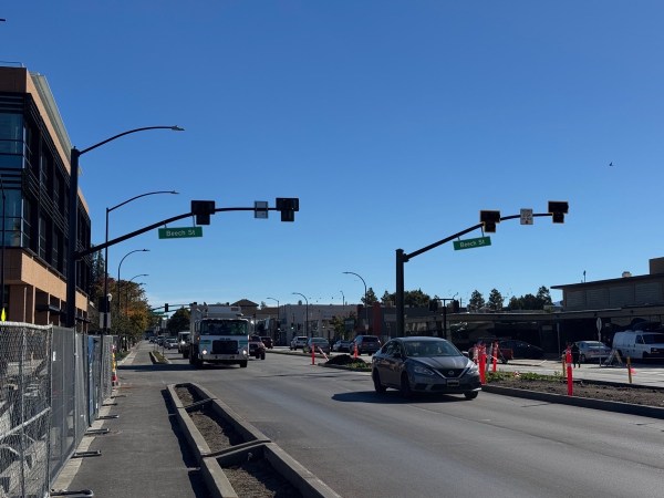 While I’m in the area, the new HAWK (high-intensity active crosswalk) beacons on El Camino Real at Beech Street have been installed and just might be active: