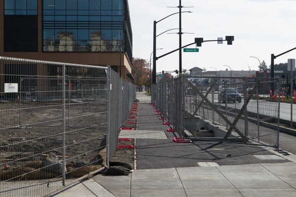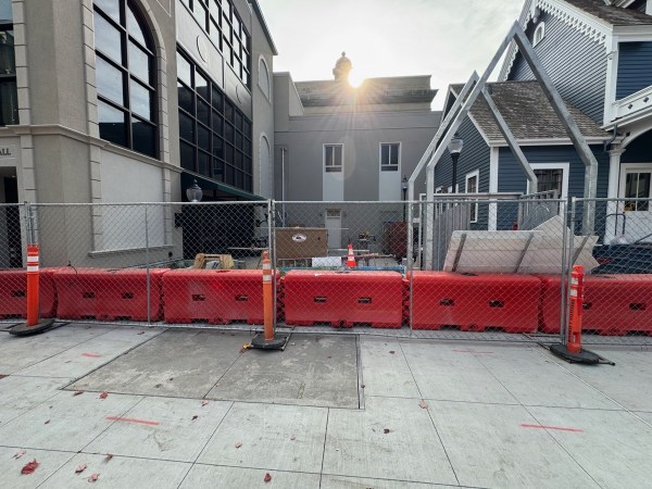 The sidewalks around Broadway Village are still behind construction fences and orange traffic barriers, but I was delighted to see that the sidewalks along two sides of the Taube Family Carriage House and Automobile Gallery (on Marshall Street, behind Redwood City’s historic courthouse) were open when I was out walking on Tuesday. I’ll note that on Thursday I saw that the construction fences had been taken down altogether — but I didn’t have an opportunity to take photos showing the fencing gone altogether: