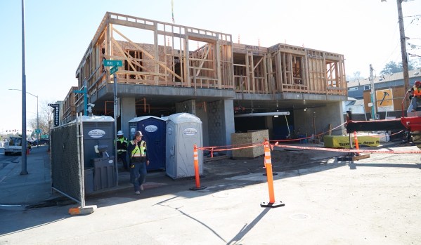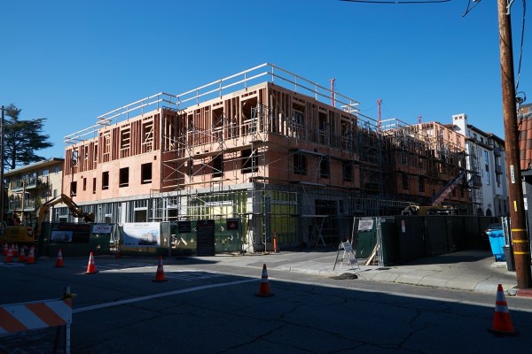This will be a 100% affordable housing project (except for one unit, which will be home to the building manager). It will be a fairly basic project, with no pools or other such amenities. There will be a community room in the south building, as well as a small (just under 1,000 square foot) outdoor area on the side of the south building away from El Camino Real. Otherwise, it will just consist of the apartments, the lobbies (one in each building), a management office, and parking — which will not be in an enclosed garage but will instead be in what the developer refers to as “tuck-under” parking: basically, a garage with no door on the ground floor of the building. The entrance to that parking area, which you can see towards the right in the below photograph, will be from Hill Street: