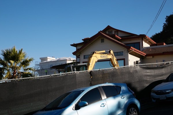 I used the next street to the north — Anita Avenue — to hike up to the top of the project, but construction fencing, trucks, and other buildings prevented me from getting a decent view of the project from up there. This is the best I could do (the building that looks like a house was The Vans; to the left of it is the highest part of the new housing project):