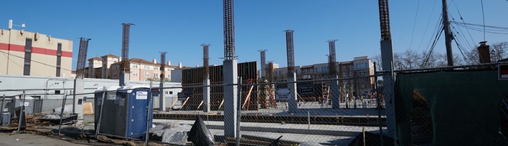 One project that is zooming along is the affordable housing project at 112 Vera Ave. When I was last there, the rebar and piping to be embedded in the building’s foundation was in place, and I was anticipating a large concrete pour very soon. Naturally, just as soon as I left town one of my readers wrote in and sent me a picture of cement mixers waiting along El Camino Real and Vera Avenue. Now, exactly one week after that pour, not only has the concrete set, the contractors have done a great deal of work to place rebar for the support pillars that will run through the first two levels, and rebar for the few concrete walls that will help form the building’s first level: