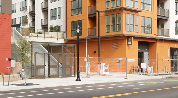 The orange-and-white building (as opposed to the rust-colored one at the left edge of the photo) in the above is the third of the three residential buildings; it is still being worked on. Thus, the construction fencing that, for now, also blocks the entrance to the parking garage (which is between The Millton and this third building, which will likely get its own name sometime in the future, but just may be considered part of The Colton, which is the large market-rate apartment building along Broadway). Note that the gates that restrict access to the building’s future residents are in place, and that there is a parking sign affixed to the orange building. As soon as residents begin taking up occupancy in The Millton (something that could happen as soon as this month) the construction fencing will be shifted to provide access to the garage, since this is the entrance/exit that residents of The Millton will largely be using.