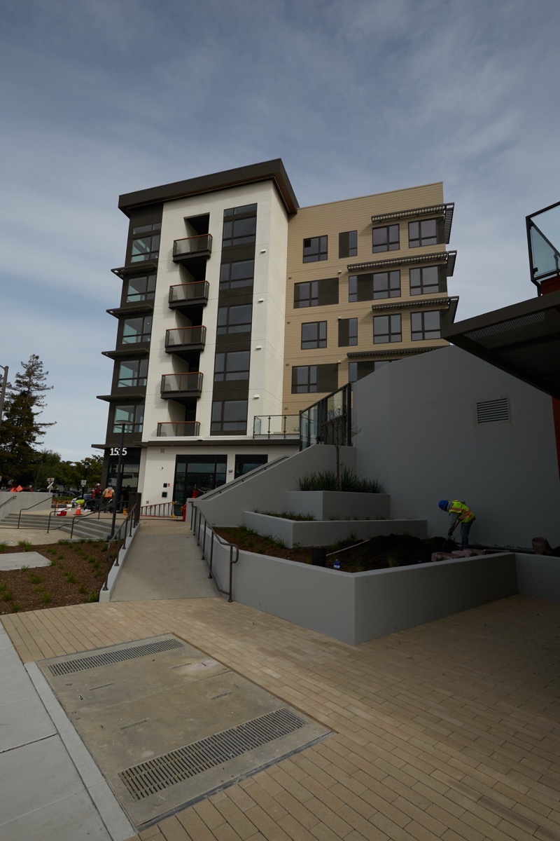 The sidewalks are open here — no construction fencing! — and the landscapers are putting the finishing touches on the grand staircase that makes its way up to the residents-only common outdoor spaces for residents of The Colton and the building along Bay Road (The Millton has its own residents-only common outdoor space, with a its own access staircase on Chestnut Street).