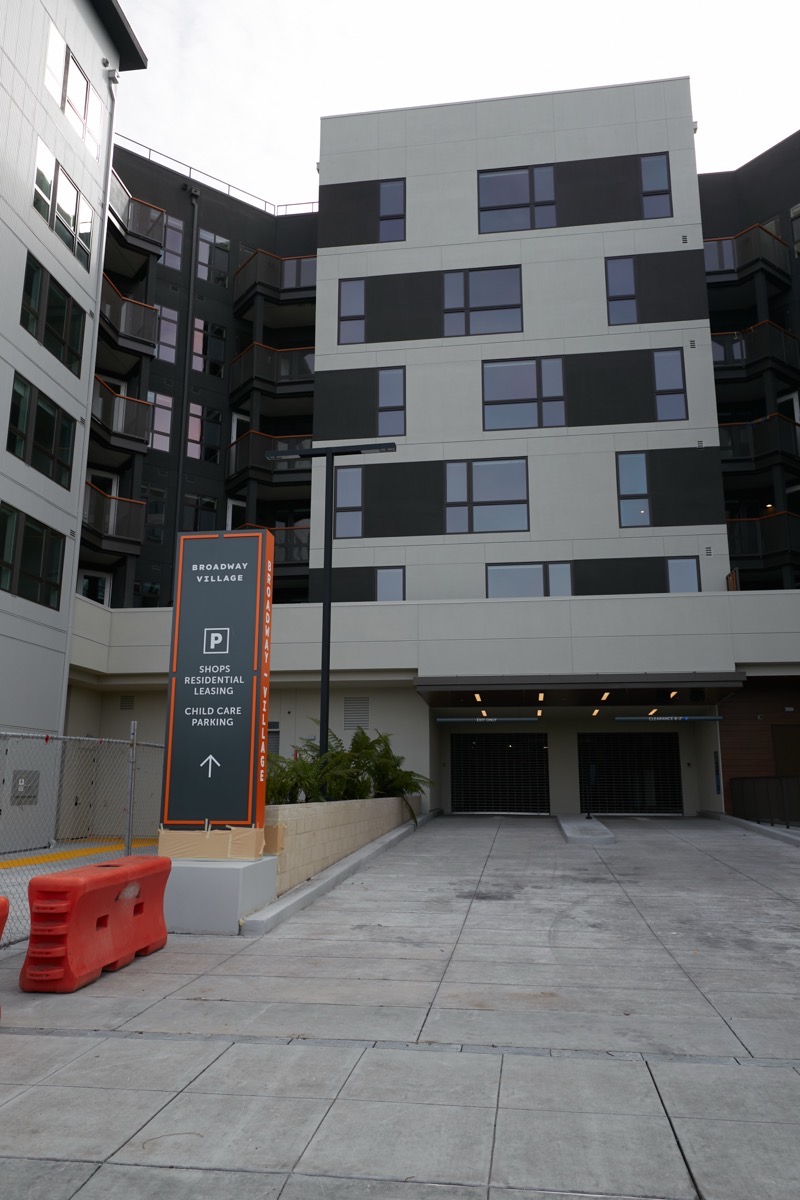 On Broadway, the sidewalk in front of The Colton is half open: construction fencing blocks off the half down towards Woodside Road, where the traffic lane closest to the project still needs to be repaved. But note the parking signage, the “Broadway Village” sign at the far end of the building, and the free-standing orange sign at the Broadway entrance to the parking garage: