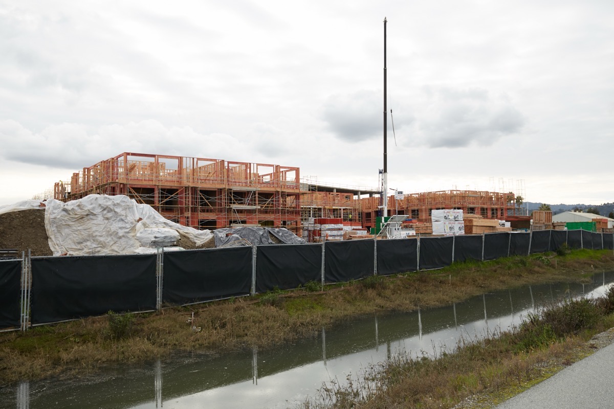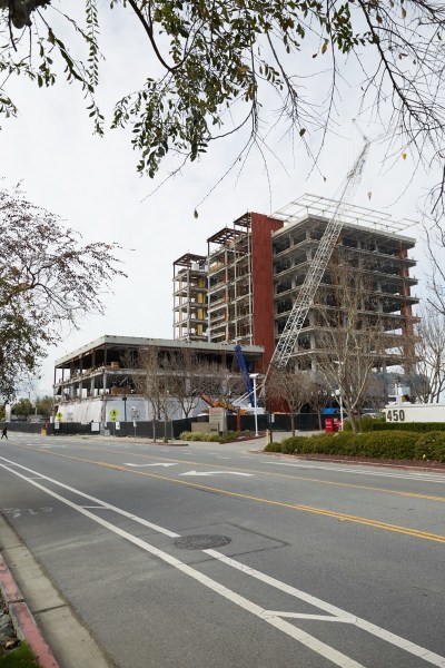 Out on E. Bayshore Road, the five-story apartment building that is under construction roughly where the Century Park 12 Theaters building used to stand is zooming along: on the bay side of the building, at least, three of the building’s five stories have largely been framed up (around other sides of the building, the framing is only up to the second story). The garage that will form the central core of the structure is rapidly disappearing behind the veritable forest of wood (and some steel) framing: