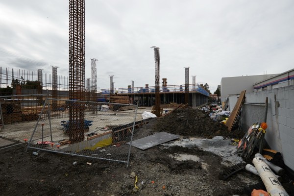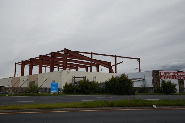 Some time ago I had noted that the Hyperion climbing gym, on Spring Street near Woodside Road, was literally raising the roof on an adjacent building to allow for taller climbing walls. The metal framing needed for that project was erected a month or two ago, but just today I noticed that one of the beams and its supporting post had fallen over — perhaps from the recent winds?
