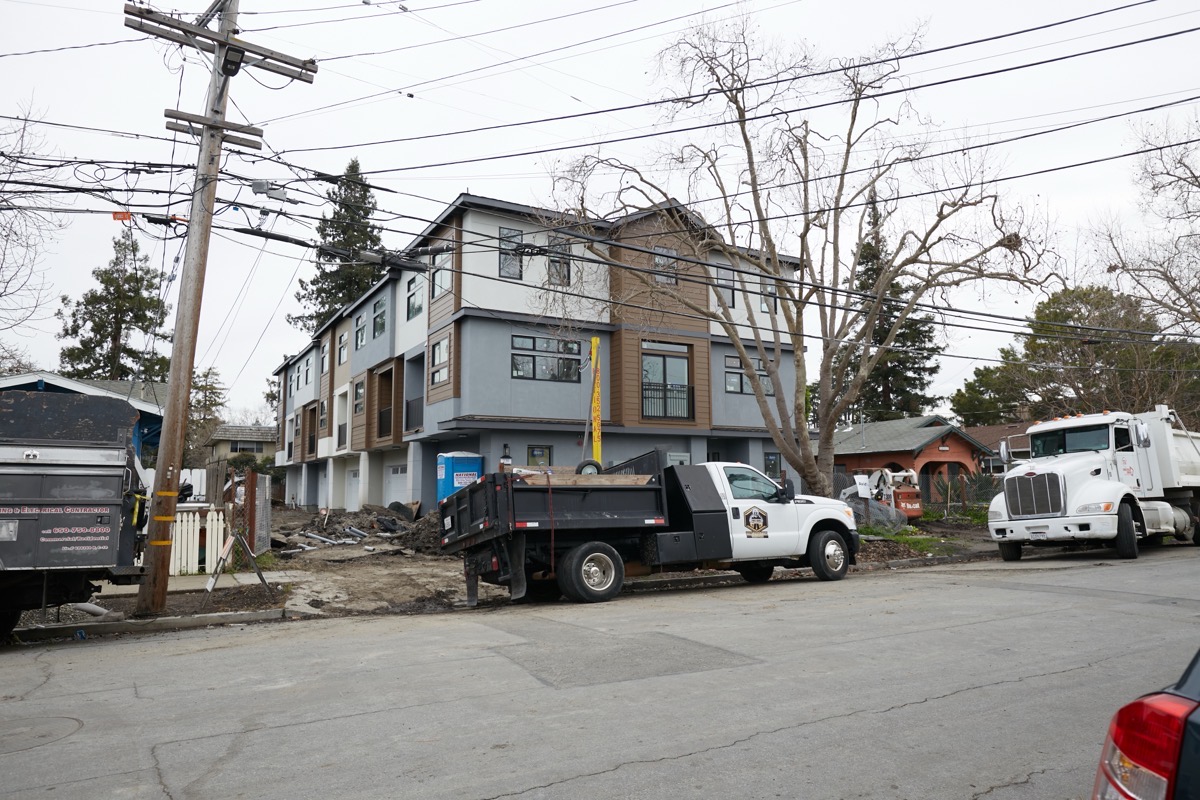 The five-unit townhouse development at 239 Vera Ave. has suddenly shifted back into high gear, after several weeks of seeming inactivity. When I went by today, a bobcat was being used to clear out the side of the building where the unit front doors are located, and electricians were hard at work doing something with the main feeds in front of the building. All of that activity means trucks, and those trucks were making it hard to get a good image of the work, but here is an updated progress photo: