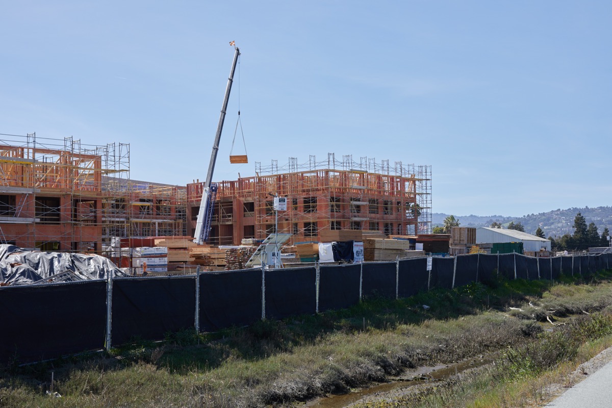 Eventually I made my way out to 557 E. Bayshore, where the large apartment building — which is clearly visible from Highway 101 — continues to make steady progress. This week, a portion of the building on the side facing the bay was getting its fourth story (out of five):