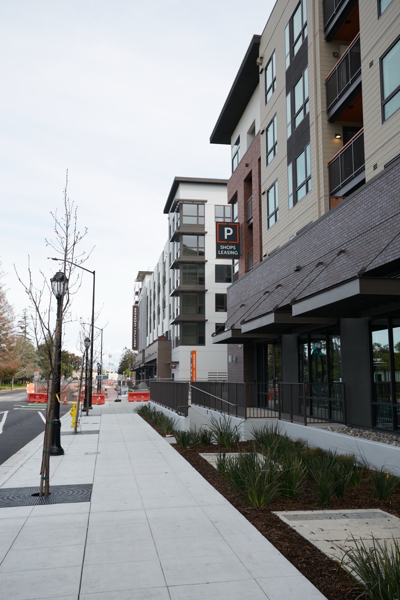 Together, these three buildings contain 520 for-rent apartments: 120 affordable, and 400 market-rate. As well, the building that fronts onto Broadway contains a 10,000-square-foot childcare center and 11,000 square feet of retail space. But where one hand giveth, the other taketh away: it seems that conditions are not yet favorable for the three office buildings that have been planned to occupy the reminder of the 11.2 acre site, and thus construction on those will not get underway shortly, as I had anticipated. Thus, we may find ourselves staring at the undeveloped half of the parcel — the half of the site towards Woodside Road — for some time to come…
