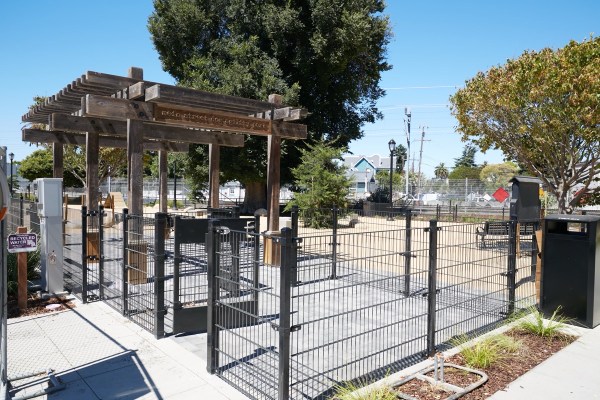 As you can see, the crosswalks and center striping still need to be painted, and the asphalt immediately around the manhole covers still needs to be added (or it did; these pictures were taken last Tuesday). But the Main Street Dog Agility Park appears complete (but not quite open to the public yet); look closely and you can even see that it has a nice carved wooden sign affixed to the wooden shade structure near the entrance: