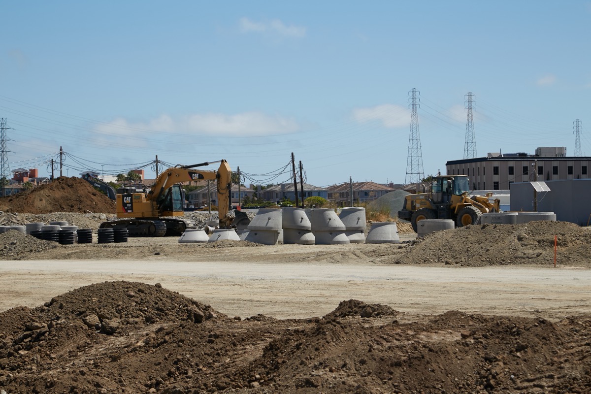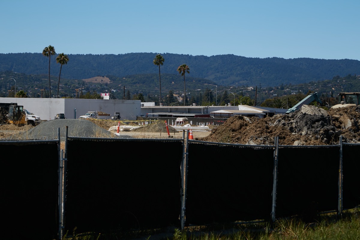 The project out at 557 E. Bayshore — where the Century Park 12 Theatres used to be — is one of the former: it is still in the early stages, with most of the work currently focused on installing the necessary underground infrastructure. Most of that is hard to really see, especially given that there are no nearby elevated vantage points from which I can observe the work. Thus, I have to content myself with pictures like this (taken from the bay side of the project):