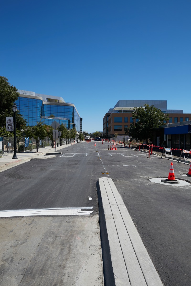 And as far as I can tell, three of the four office buildings are pretty much done, with the fourth still receiving a few exterior bits. The build-out of the interiors may still take some time, and from what I can tell should initially be concentrated on the two buildings between Main Street and the Caltrain tracks: those, I believe, are the ones that have been leased to the Chan Zuckerberg Institute for Advanced Biological Imaging. And speaking of those two buildings, take a look at what I spotted up against the tracks between them: