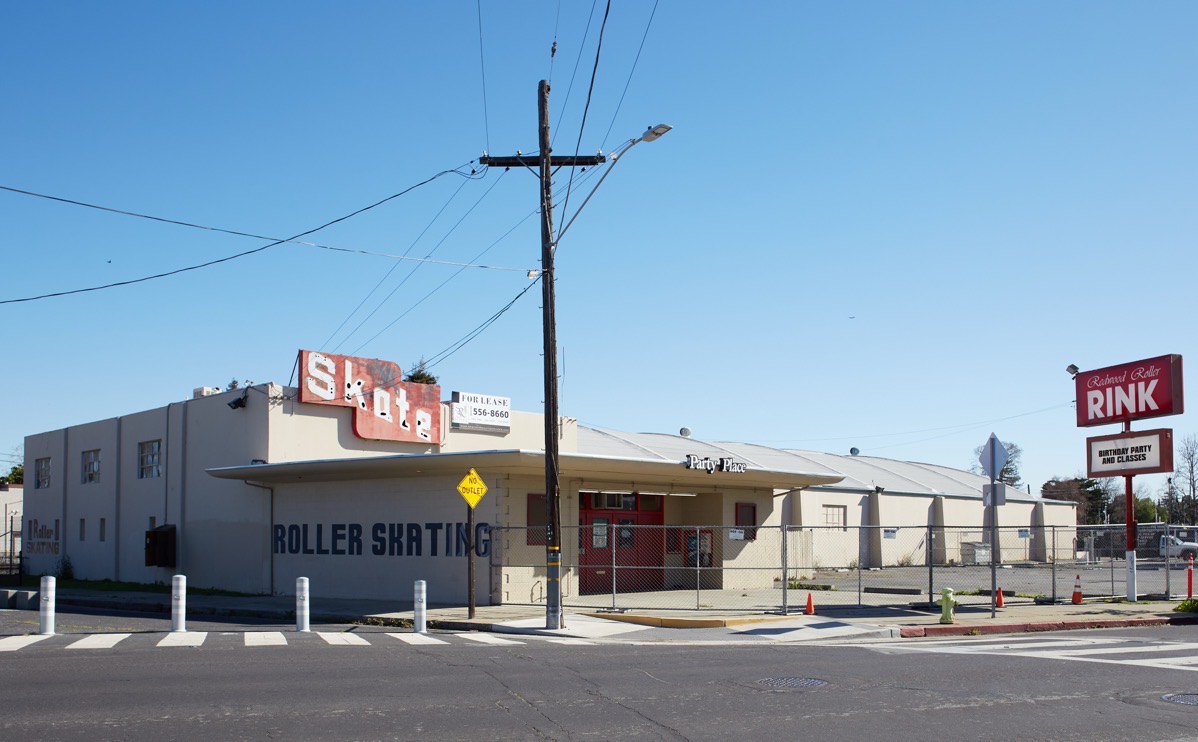 Presumably, this is a bit of public art, either using the actual sign from the old roller rink that used to stand where one of the new buildings is now, or using a replica. For those readers that weren’t here back then, or for those who don’t remember, this is what that building, with that sign affixed to it, looked like shortly before it was demolished: