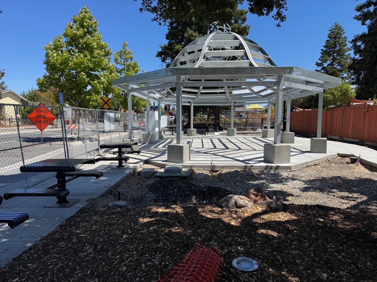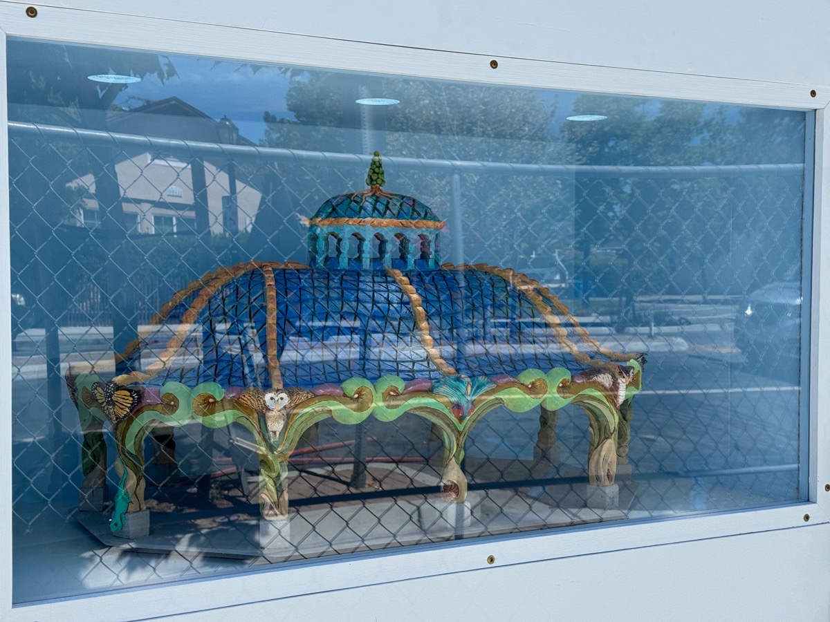 Pretty wild, huh? I presume the artist who will be decorating what today is simply a metal skeleton created this model to show the city what they have in mind. I especially love the animals marking the top of the uprights that support the roof… For those who missed my previous mention, here is a photograph of what that metal structure currently looks like: